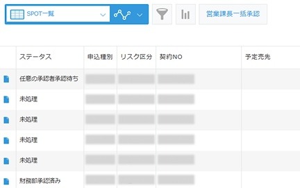現状のステータス、担当者を可視化している。また、レコードの変更履歴から、承認時間や承認者を確認可能としている。一覧画面上でレコードごとのステータスが確認可能で、ステータスごとの絞り込み表示も可能。